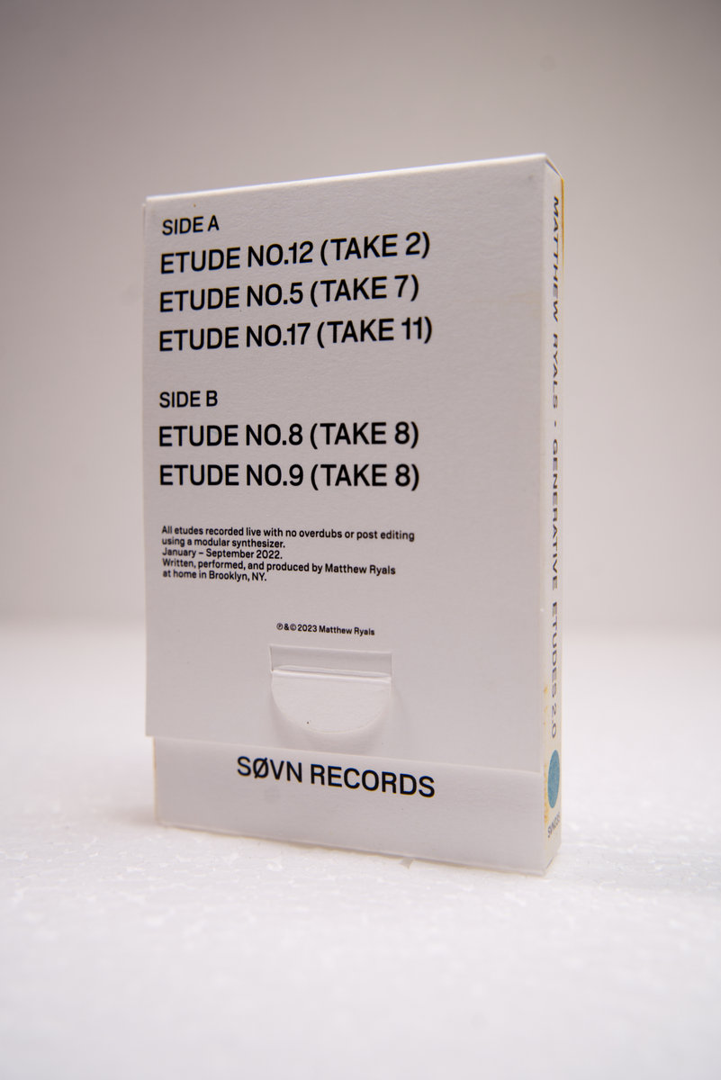 Matthew Ryals is a musician and educator from New York, whose music can be understood as the product of a collaboration between the human and the machine. Last year, he set out to visit the worlds explored by his modular synthesizer for 30 days. Results from the first worlds visited by Matthew have recently been published on dingn\dents and Behind Glass as Generative Etudes Vol 1.0, 1.1 and 1.2; SØVN Records is proud to publish the first selection from the second series of trips - named Generative Etudes Vol 2.0. In the next few months, Vol 2.1 - 2.2 will both be released on Matthew's own imprint, Behind Glass, and will feature alternate takes of the generative patches.